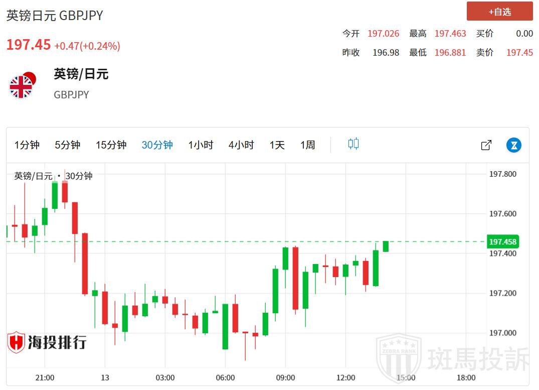 英镑/日元叉盘处在周线低位附近,即196.85-196.80区域吸引了一些逢低买盘,并收复前日部分跌幅。不过,英镑/日元仍维持在震荡区间,目前交投于197.30-197.35区域附近,全天涨幅不到0.15%。
