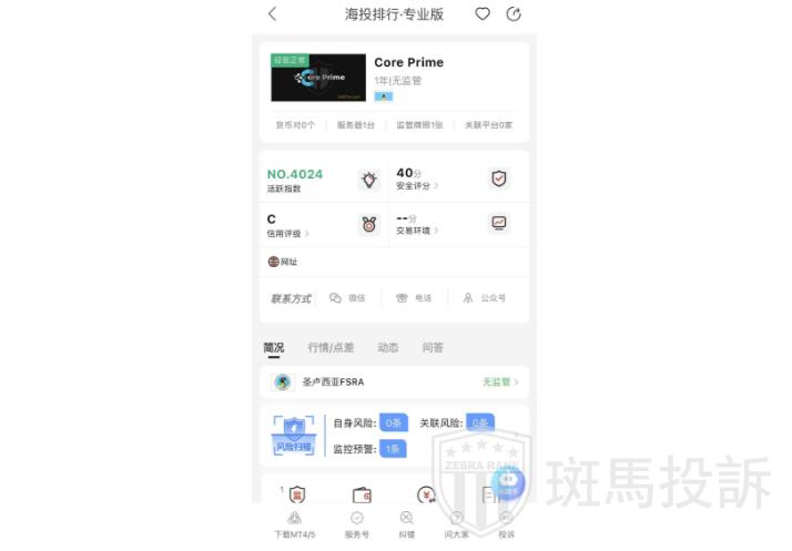 这家叫Core Prime的平台,成立于2024年,全球活跃指数4024名,目前无监管,也没有外汇牌照,不能做外汇保证金交易,风险扫描显示1条风险,投资者资金安全无保障。
