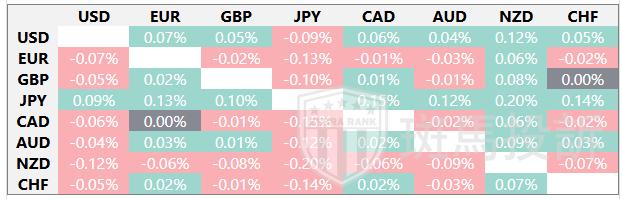 下表显示了澳元(AUD)对所列主要货币今日的变动百分比。澳元兑日元最弱。