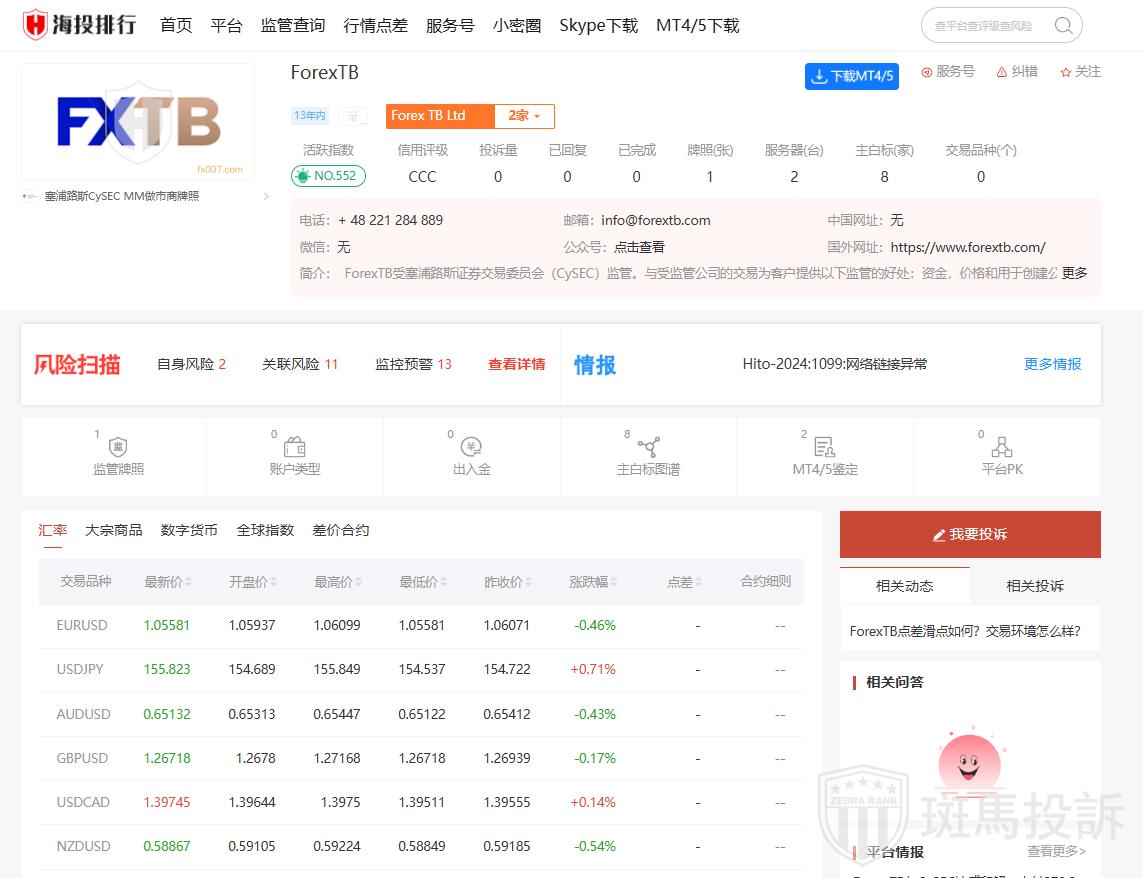 ForexTB外汇经纪商平台是一家提供外汇交易服务的知名平台,成立于2011年,总部位于塞浦路斯。该平台不仅提供外汇交易,还涵盖了贵金属、原油等多种金融产品。ForexTB受塞浦路斯证券交易委员会(CySEC)和英国金融行为监管局(FCA)的监管,具有较高的合规性和安全性。