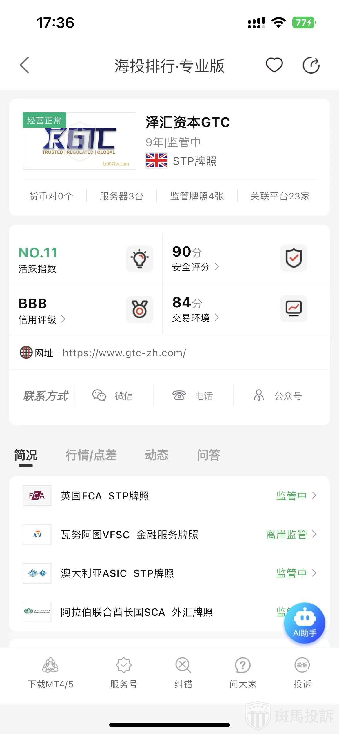 根据海投排行查询显示,这家平台叫泽汇资本GTC,成立于2016年,全球排名11名,安全评分90分,该平台目前拥有4个国家的监管牌照.
