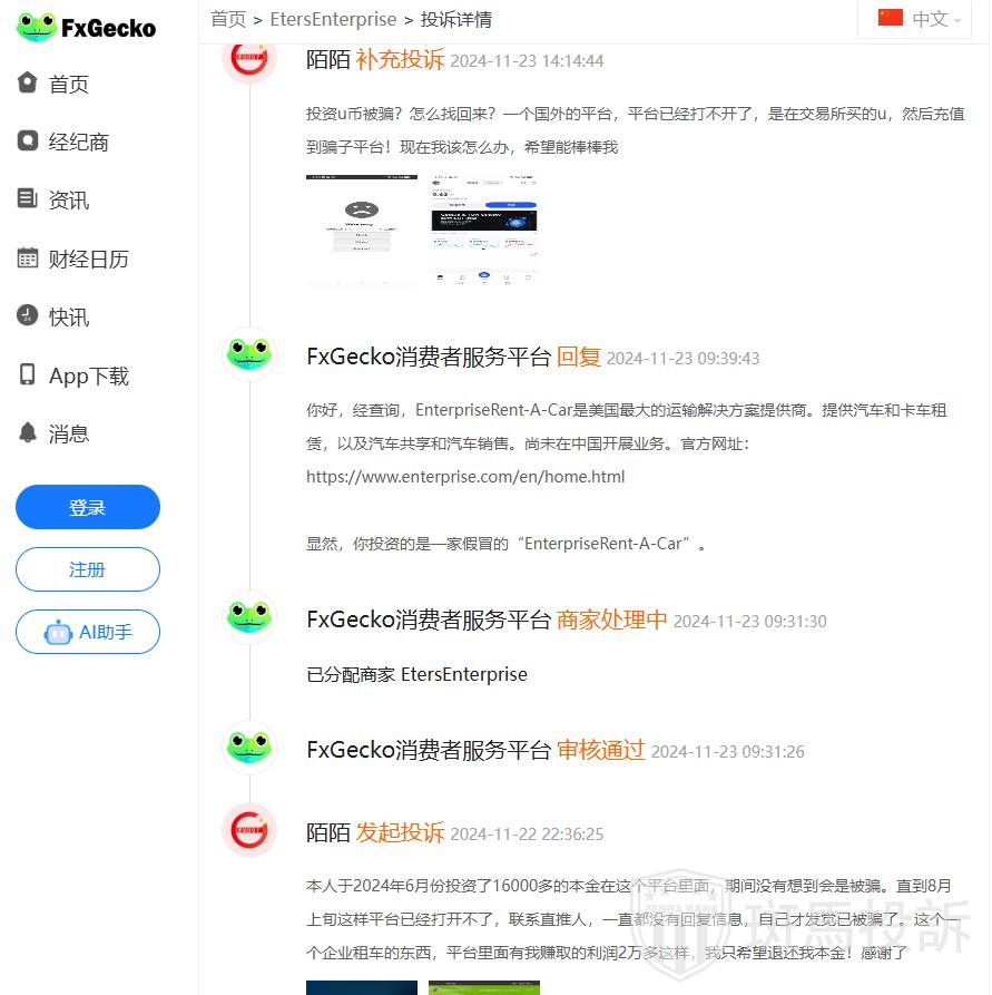 最近,有用户投诉今年6月在Enterprise Rent-A-Car投资了16000多本金,期间没有想到会被骗。直到8月上旬这家平台已经打开不了,联系直推人,一直都没有回复信息,自己才发觉已被骗了。这是一个企业租车的平台,用户是在交易所买的u,然后充值到这个骗子平台,平台里面有用户赚取的2万多利润,现在用户只希望能退还本金,但不知道该怎么办。