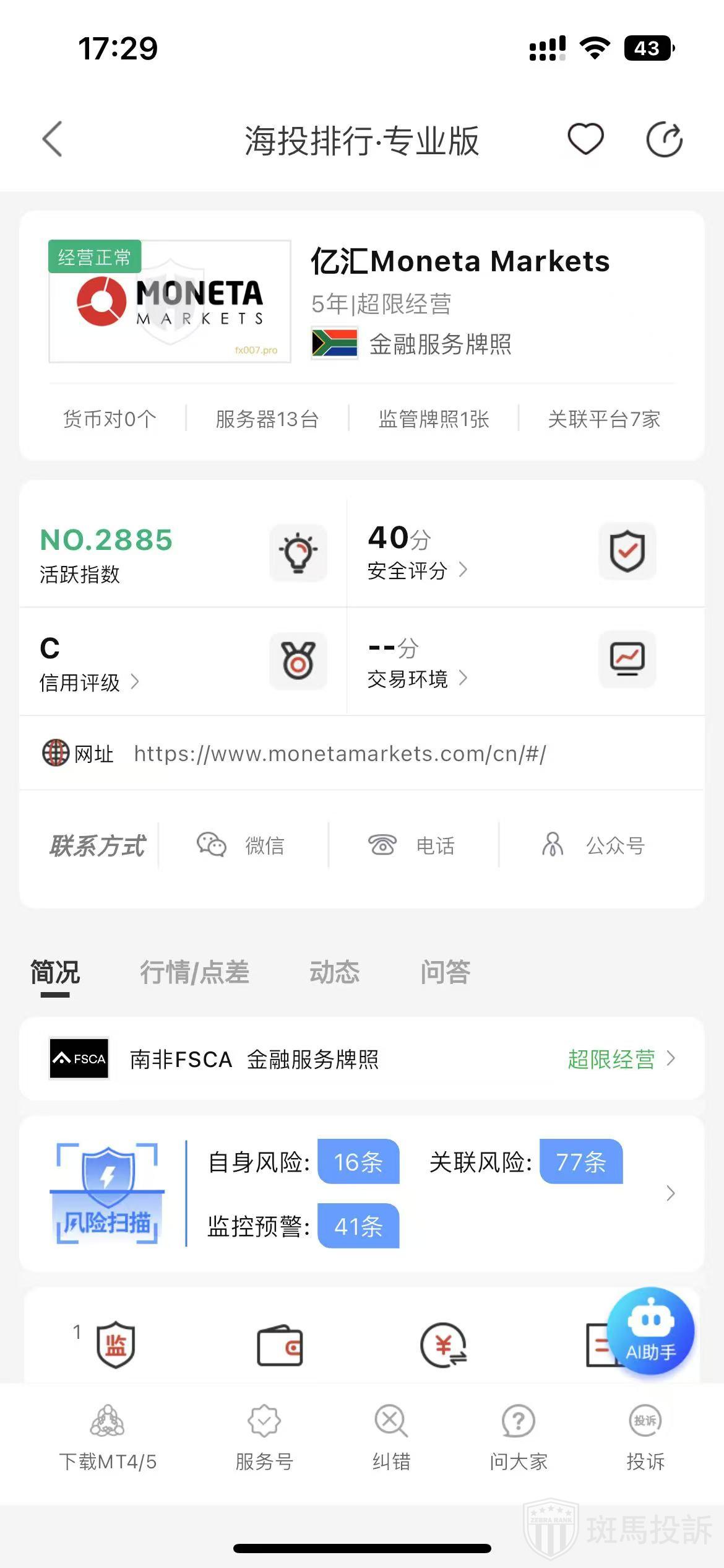 根据海投排行查询显示,这家平台叫Moneta Markets,成立于2020年,全球排名2885名,安全评分40分,平台宣传称拥有南非FSCA金融服务牌照,风险扫描预警有134条.