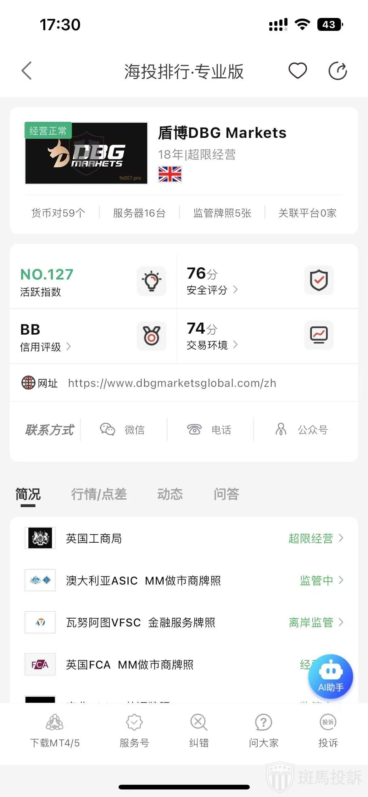 根据海投排行查询显示,这家平台叫盾博DBG Markets,成立于2007年,全球排名127名,安全评分76分,平台宣传称拥有5个国家的监管牌照,风险扫描预警有66条.