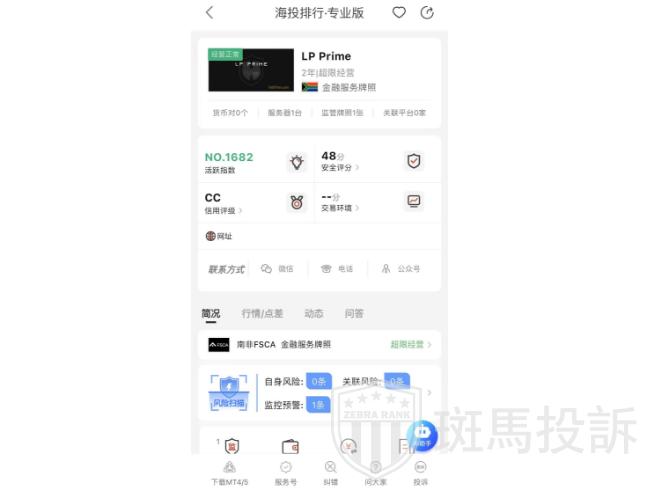 这家叫LP Prime的平台,成立于2023年,全球活跃指数5741名,目前无监管,也没有外汇牌照,不能做外汇保证金交易,风险扫描显示11条风险,投资者资金安全无保障。