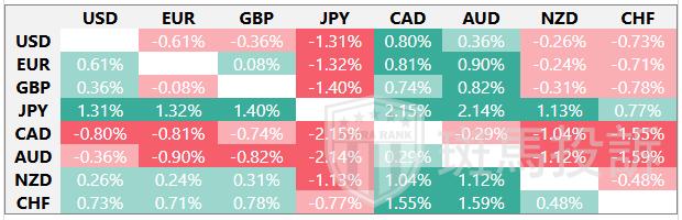 下表显示了美元(USD)对所列主要货币本周的变动百分比。美元兑日元最弱。