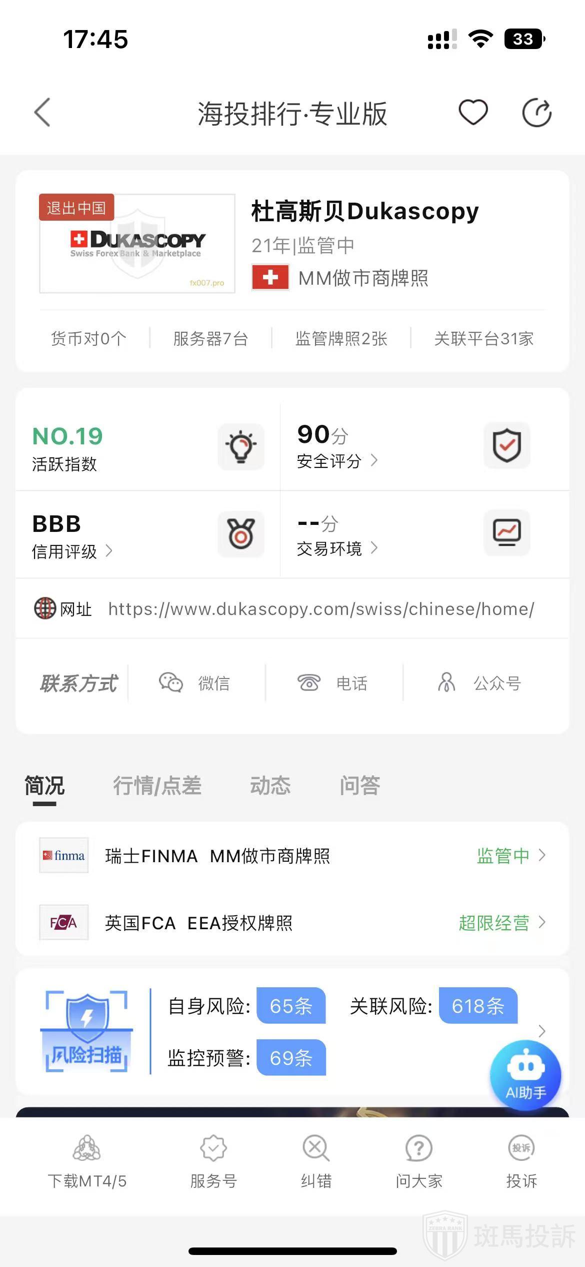 根据海投排行查询显示,这家平台叫杜高斯贝Dukascopy,成立于2004年,全球排名19名,安全评分90分,目前有2个国家的监管牌照,风险扫描751条.
