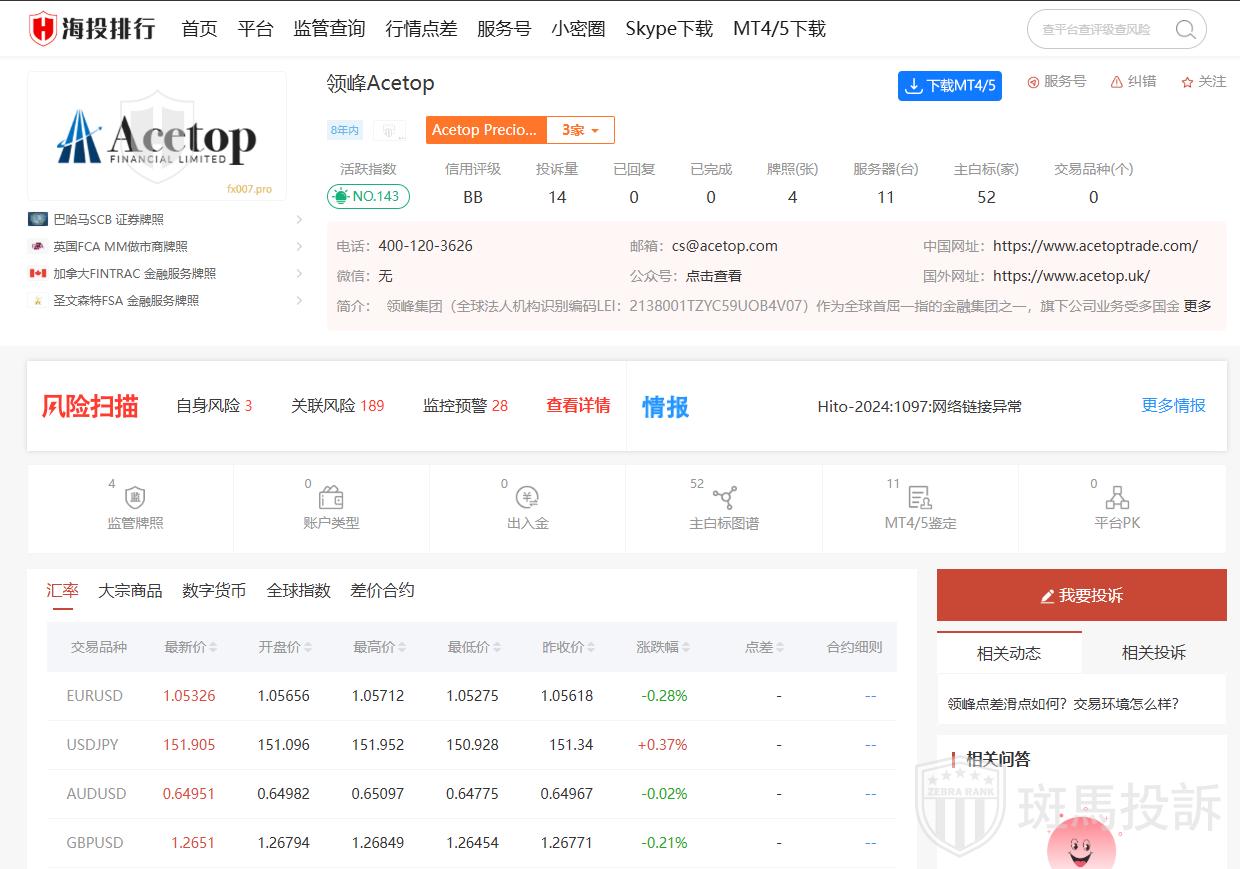 监管情况:领峰环球有限公司持有巴哈马证券监察委员会(SCB)的监管牌照。,Acetop Financial Limited受到英国FCA监管但不受金融服务补偿计划(FSCS)保护。加拿大金融交易和报告分析中心(FINTRAC)也负责监管Acetop,Acetop还取得圣文森特的金融服务牌照。因此,在选择使用任何金融服务前,建议核实最新的监管状态和保护措施。