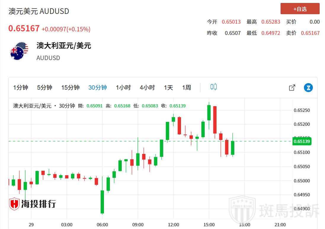 澳元/美元在周五欧洲时段的前半段削减了部分盘中涨幅,创下多日新高,略高于0.6500心理关口,连续第三天上涨。