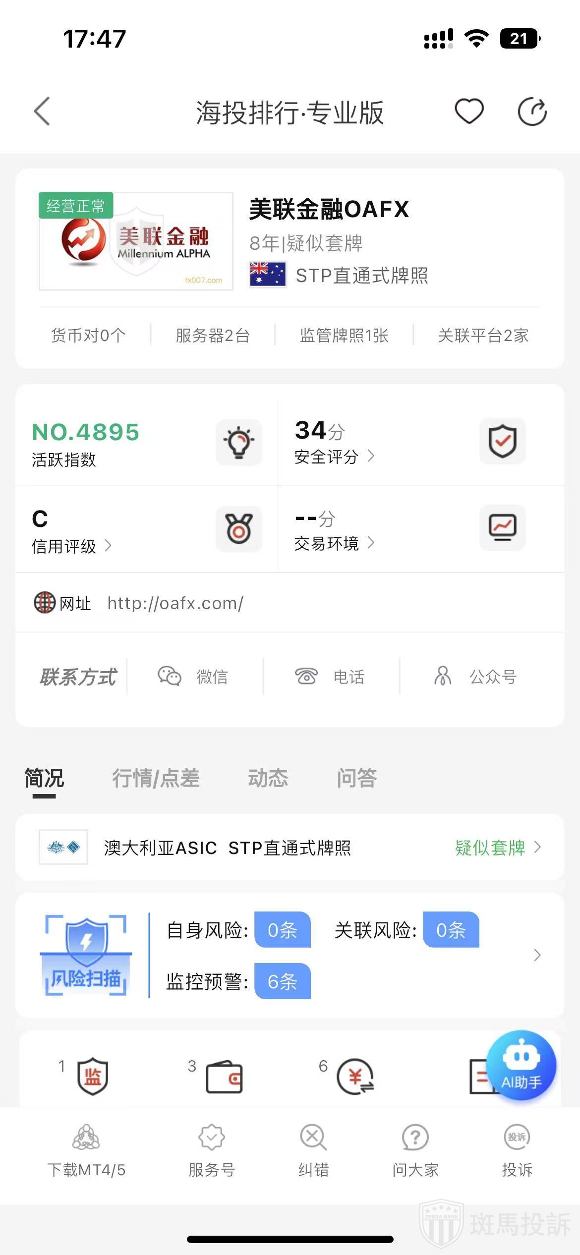 根据海投排行查询显示,这家平台叫美联金融OAFX,成立于2017年,全球排名4895名,安全评分34分,平台宣传称拥澳大利亚ASIC STP直通式牌照,风险扫描预警有7条.
