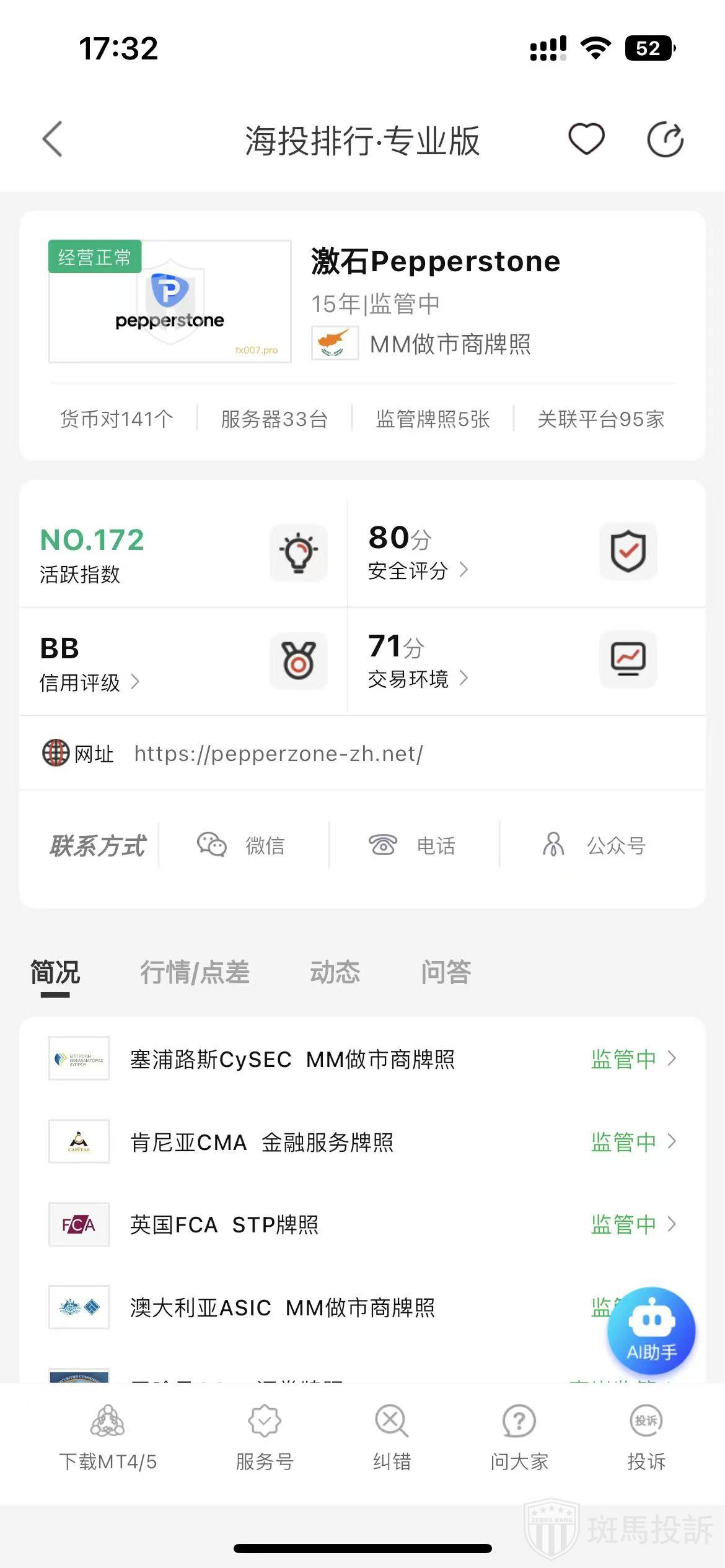 海投排行综合点评:激石Pepperstone目前官网属于正常运营中,投诉方面是因为合约报价错误或者入金延迟导致保障等交易环境问题,需要注意下。负面信息较少,各方评论总体还可以,交易品种多,就是投诉方面处理较慢。