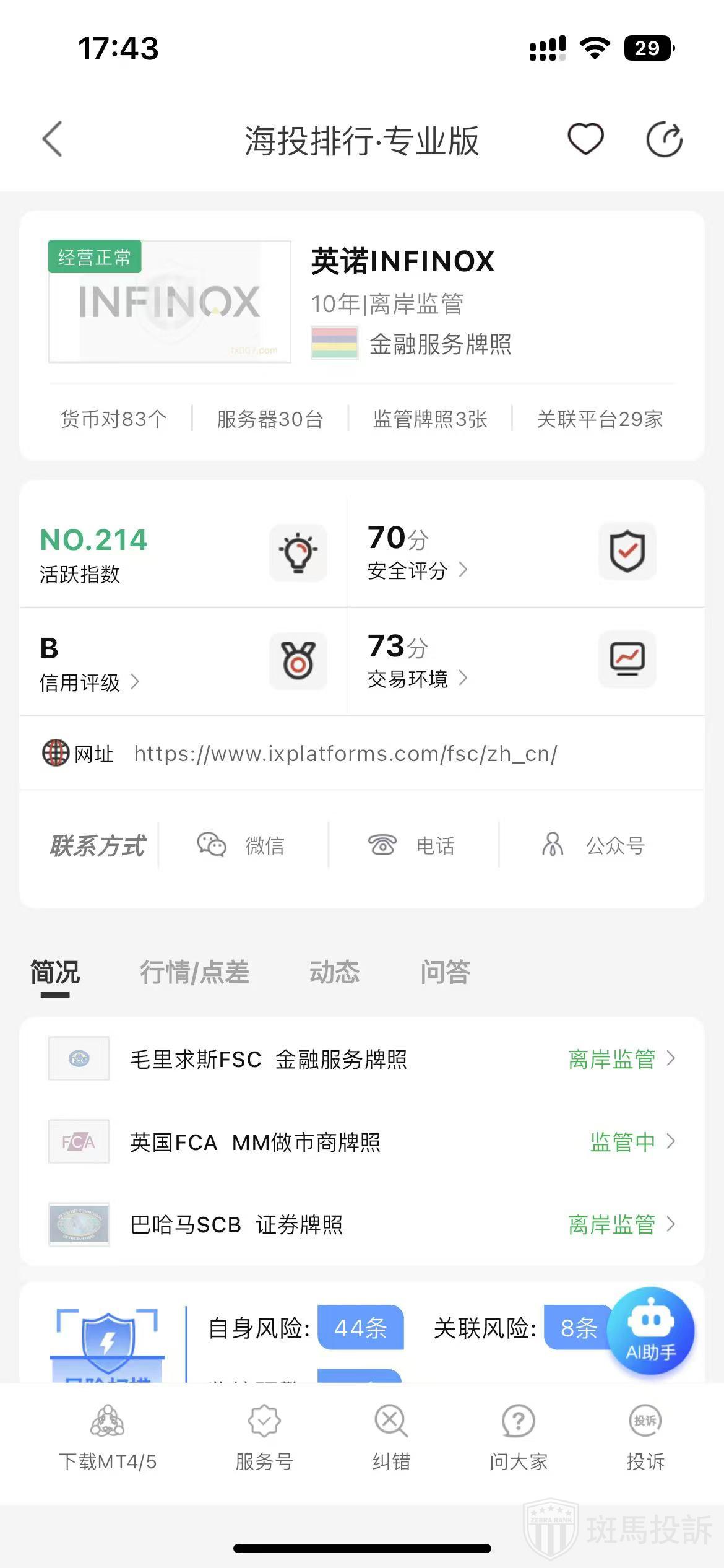 根据海投排行查询显示,这家平台叫英诺INFINOX,成立于2015年,全球排名211名,安全评分70分,平台宣传称拥有3个国家的监管牌照,风险扫描预警有107条.