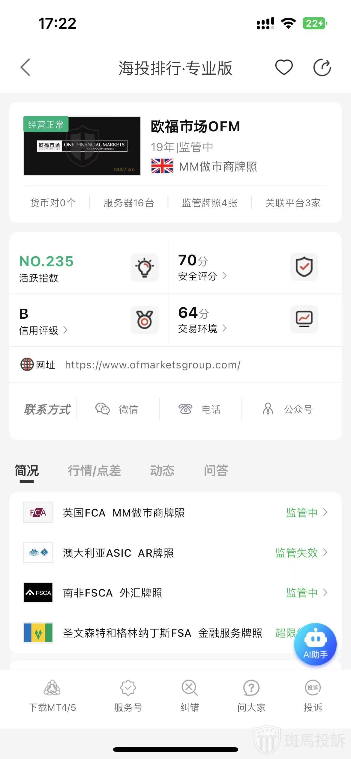 根据海投排行查询显示,这家平台叫欧福市场OFM,成立于2006年,全球排名234名,安全评分70分,平台宣传称拥有4个国家的监管牌照,风险扫描预警有68条.