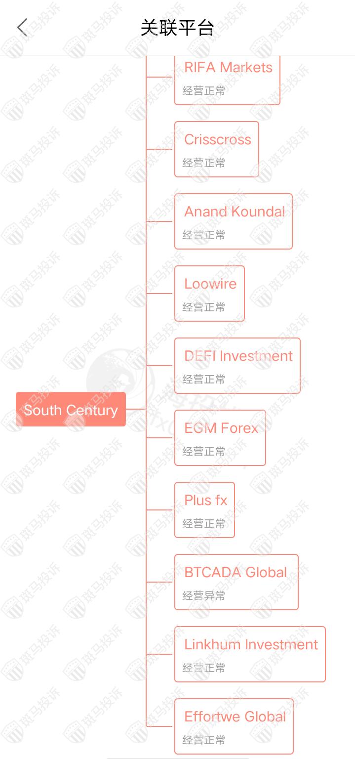 主白标关系显示,South Century平台目前和14家平台存在关联,其中1家存在经营异常情况。