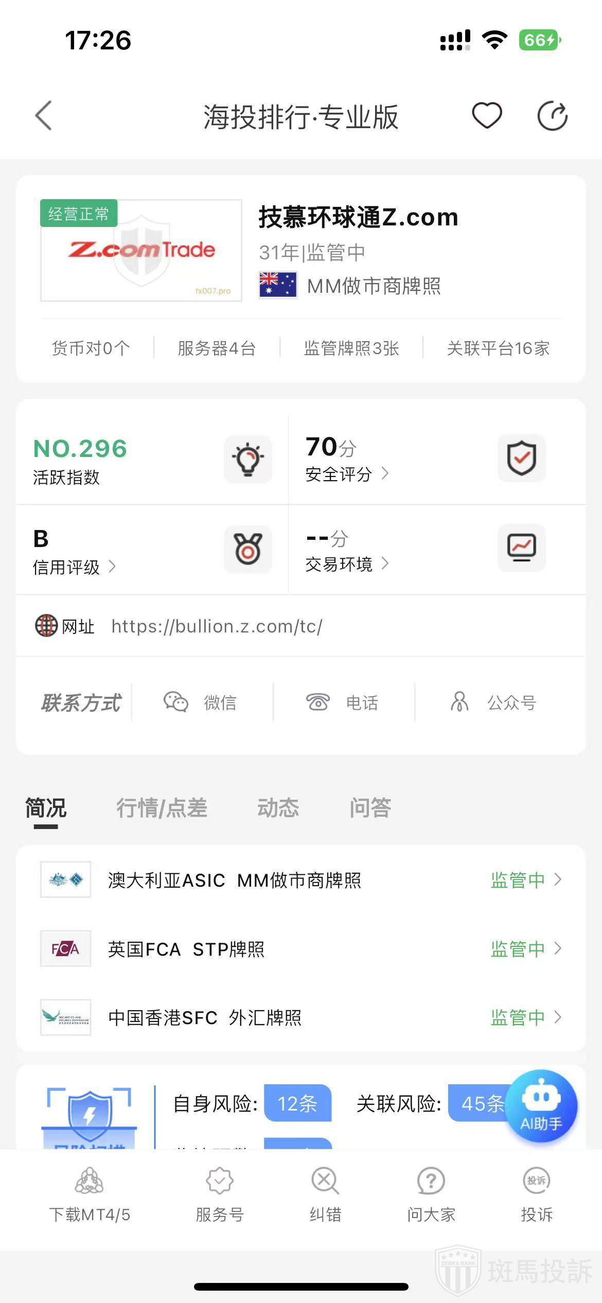 根据海投排行查询显示,这家平台叫技慕环球通Z.com,成立于1994年,全球排名296名,安全评分70分,平台宣传称拥有3个国家的监管牌照,风险扫描预警有72条.