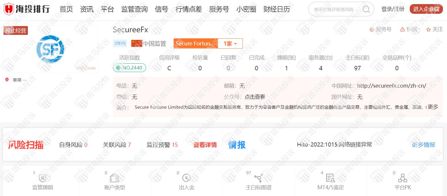 这家平台叫SecureeFx,成立于2020年,全球排名2440名,目前停止经营,无监管,没有外汇牌照,不能做外汇保证金交易,风险扫描显示15条风险,投资者资金安全无保障。