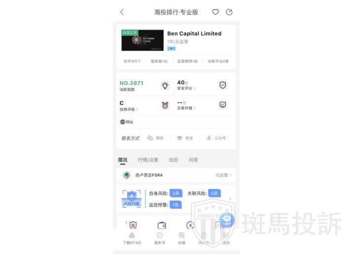 这家叫Ben Capital Limited的平台,成立于2024年,全球活跃指数3871名,目前无监管,也没有外汇牌照,不能做外汇保证金交易,风险扫描显示1条风险,投资者资金安全无保障。