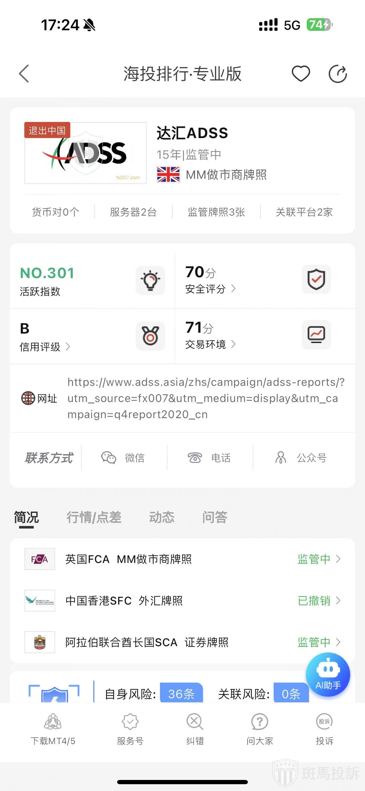 根据海投排行查询显示,这家平台叫达汇ADSS,成立于2010年,全球排名301名,安全评分70分,平台宣传称拥有3个国家的监管牌照,风险扫描预警有78条.