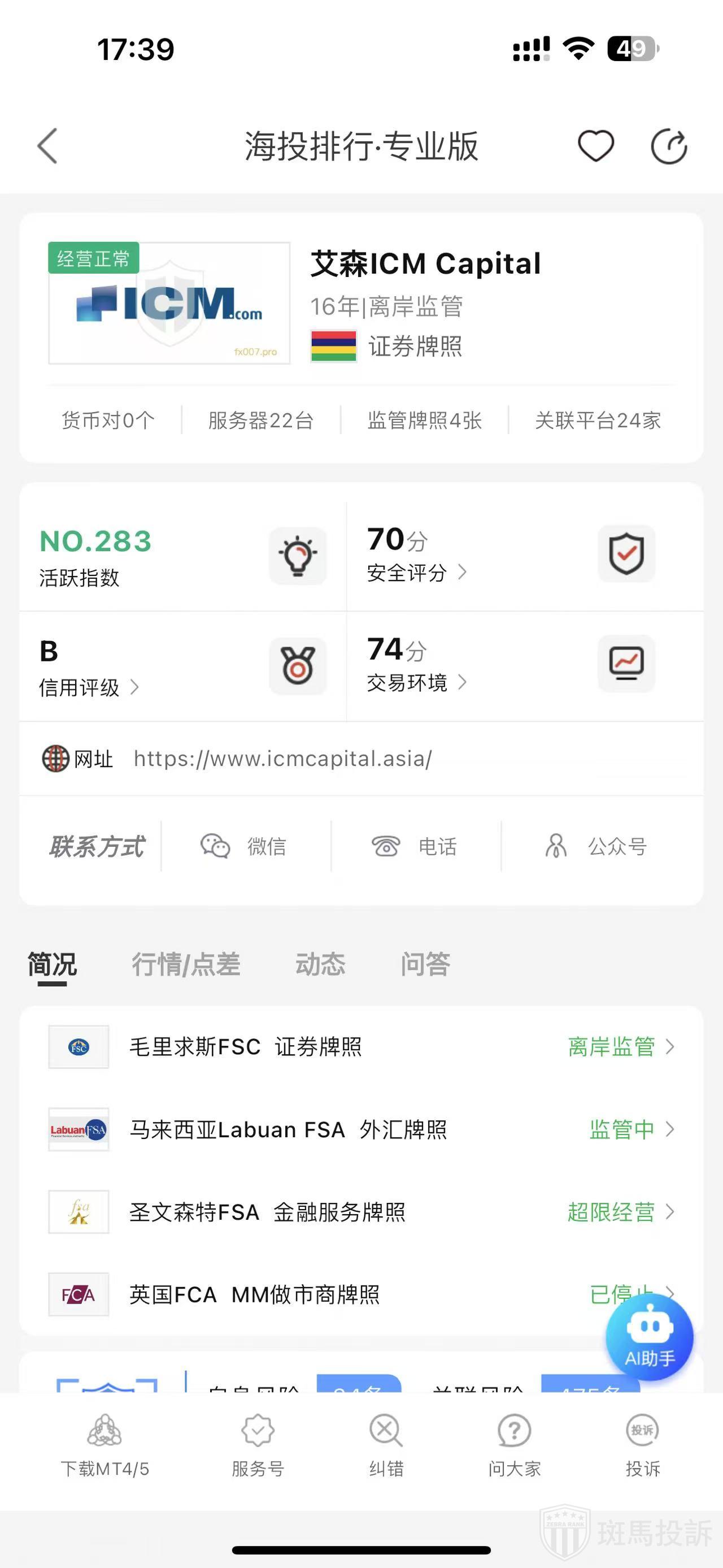 海投排行综合点评:艾森ICM Capital目前官网属于正常运营中,投诉方面是因为合约报价错误或者不给出金等交易环境问题,需要注意下。负面信息较多,各方评论总体还一般,交易品种多,投诉方面处理较慢。