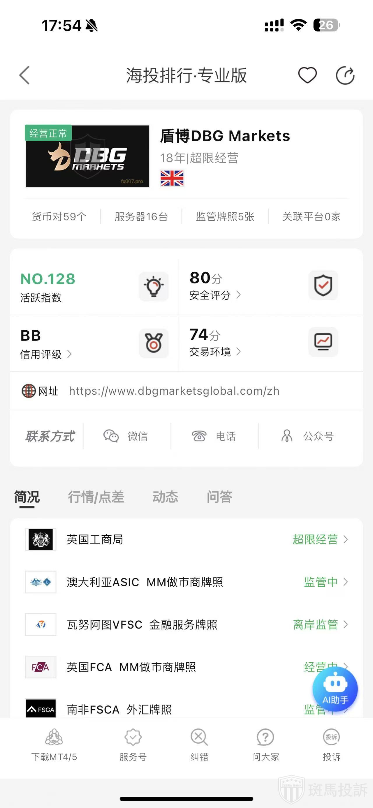 根据海投排行查询显示,这家平台叫盾博DBG Markets,成立于2007年,全球排名127名,安全评分76分,平台宣传称拥有5个国家的监管牌照,风险扫描预警有66条.