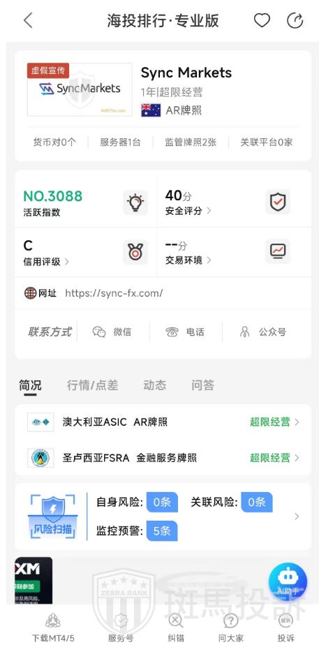 这家平台叫Sync Markets,成立于2024年,全球活跃指数3088名,目前有2个监管,但是没有外汇牌照,不能做外汇保证金交易,风险扫描显示5条风险,投资者资金安全无保障。