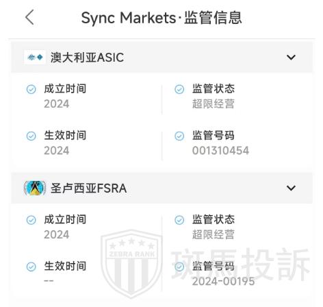 Sync Markets LTD.在圣卢西亚注册成立,注册号为2024-00195,由国际商业公司注册处注册。Sync Markets Pty Ltd(澳大利亚),澳大利亚公司注册号码:ACN 678 885 446,该公司是Rich Smart Finance Pty.Ltd.(澳大利亚金融服务牌照(AFSL)441277)的授权代表公司(澳大利亚金融服务(AFS)代表号码001310454),但是这两个监管牌照都不能监管外汇交易,在金融监管方面,还是比较欠缺的,值得投资者警惕。