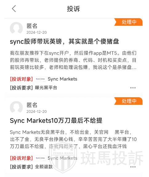 Sync Markets平台目前在斑马投诉收到2条出金问题相关的投诉。