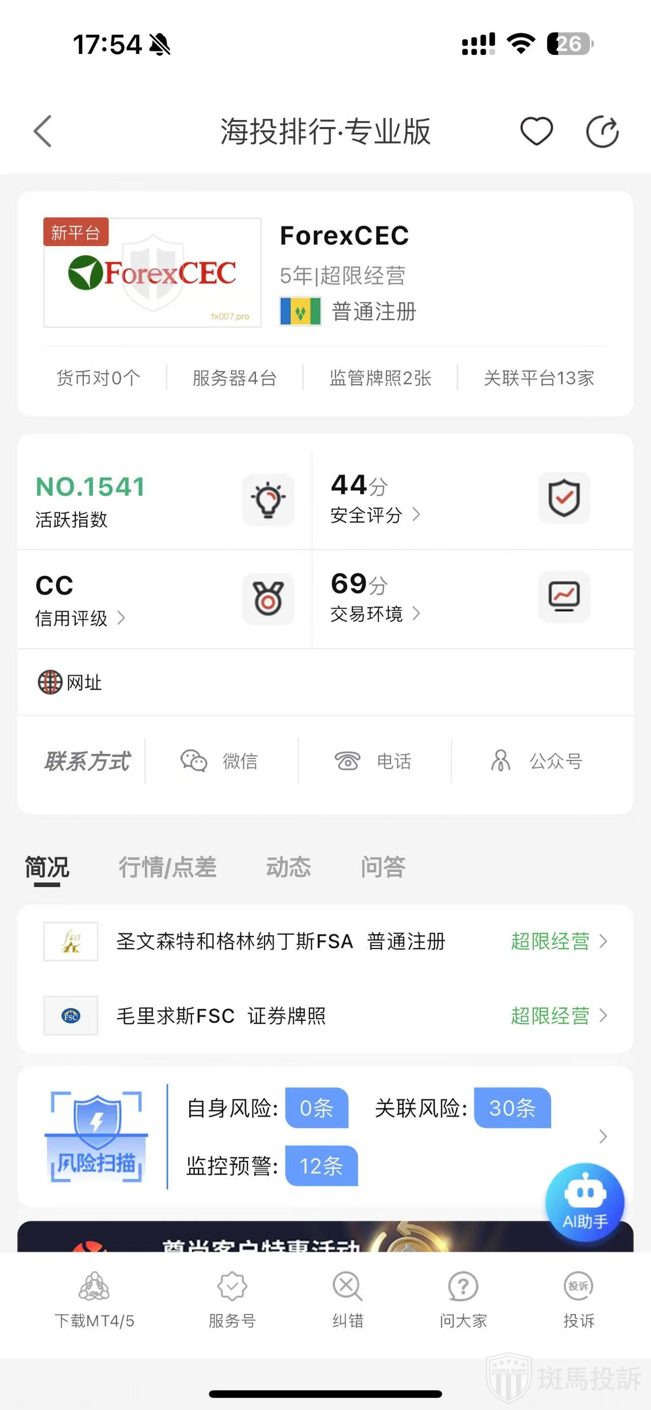 根据海投排行查询显示,这家平台叫ForexCEC,成立于2020年,全球排名1539名,安全评分50分,目前有圣文森特和格林纳丁斯FSA普通注册、毛里求斯FSC证券牌照2个监管牌照,风险扫描预警有42条.