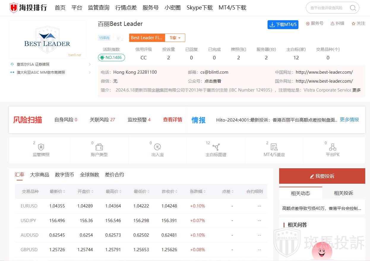 监管情况:Best Leader声称受香港华人金银业协会(CGSE)监管,并持有中国香港CGSE DS牌照。然而,它也存在“疑似套牌”的警告,意味着其某些牌照可能未经授权或存疑。