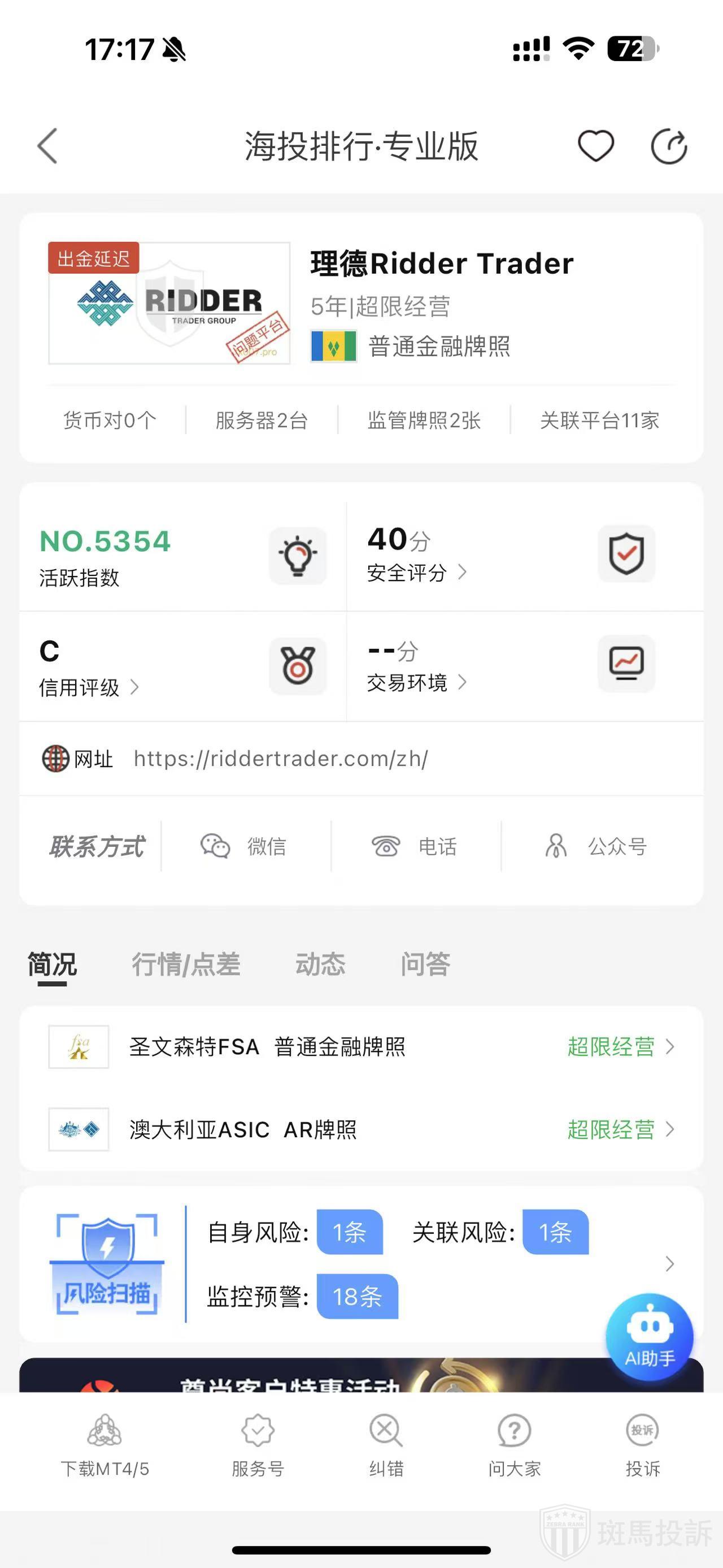 根据海投排行查询显示,这家平台叫理德Ridder Trader,成立于2020年,全球排名5334名,安全评分40分,宣传拥有2个国家的监管牌照,风险扫描预警有20条.