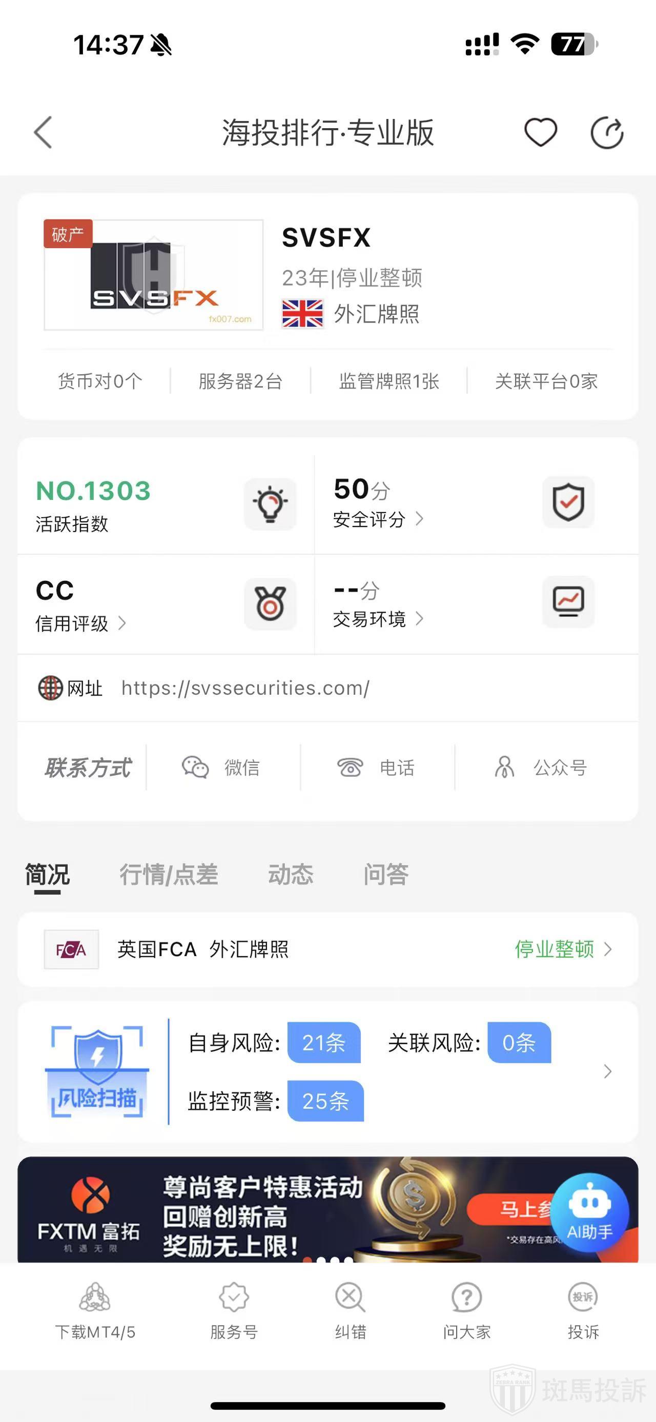 根据海投排行查询显示,这家平台叫SVSFX,成立于2002年,全球排名1299名,安全评分50分,平台宣传称拥有英国FCA外汇牌照,目前显示已经停业整顿,风险扫描46条.
