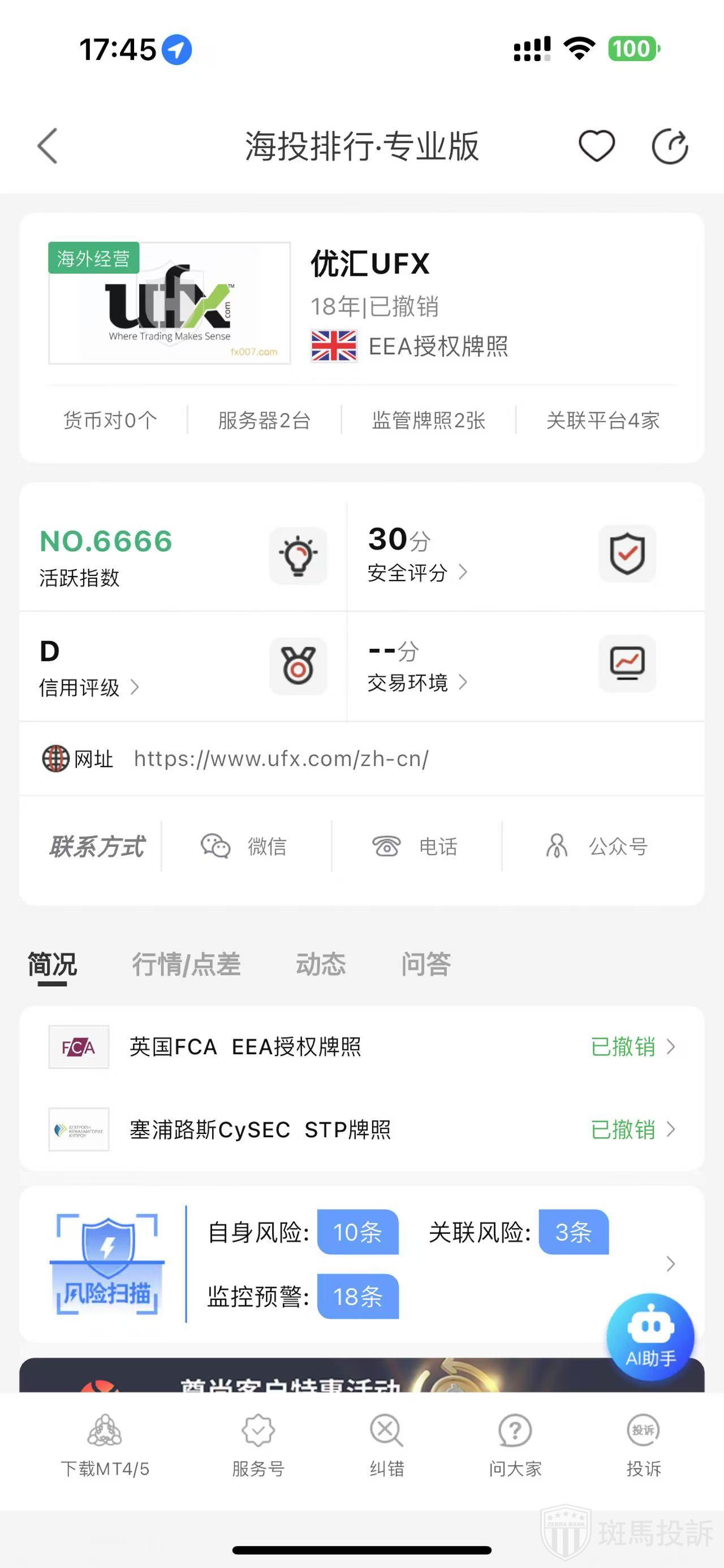 根据海投排行查询显示,这家平台叫优汇UFX,成立于2007年,全球排名6666名,安全评分30分,平台宣传称拥有2个监管牌照均已撤销,风险扫描预警有28条.