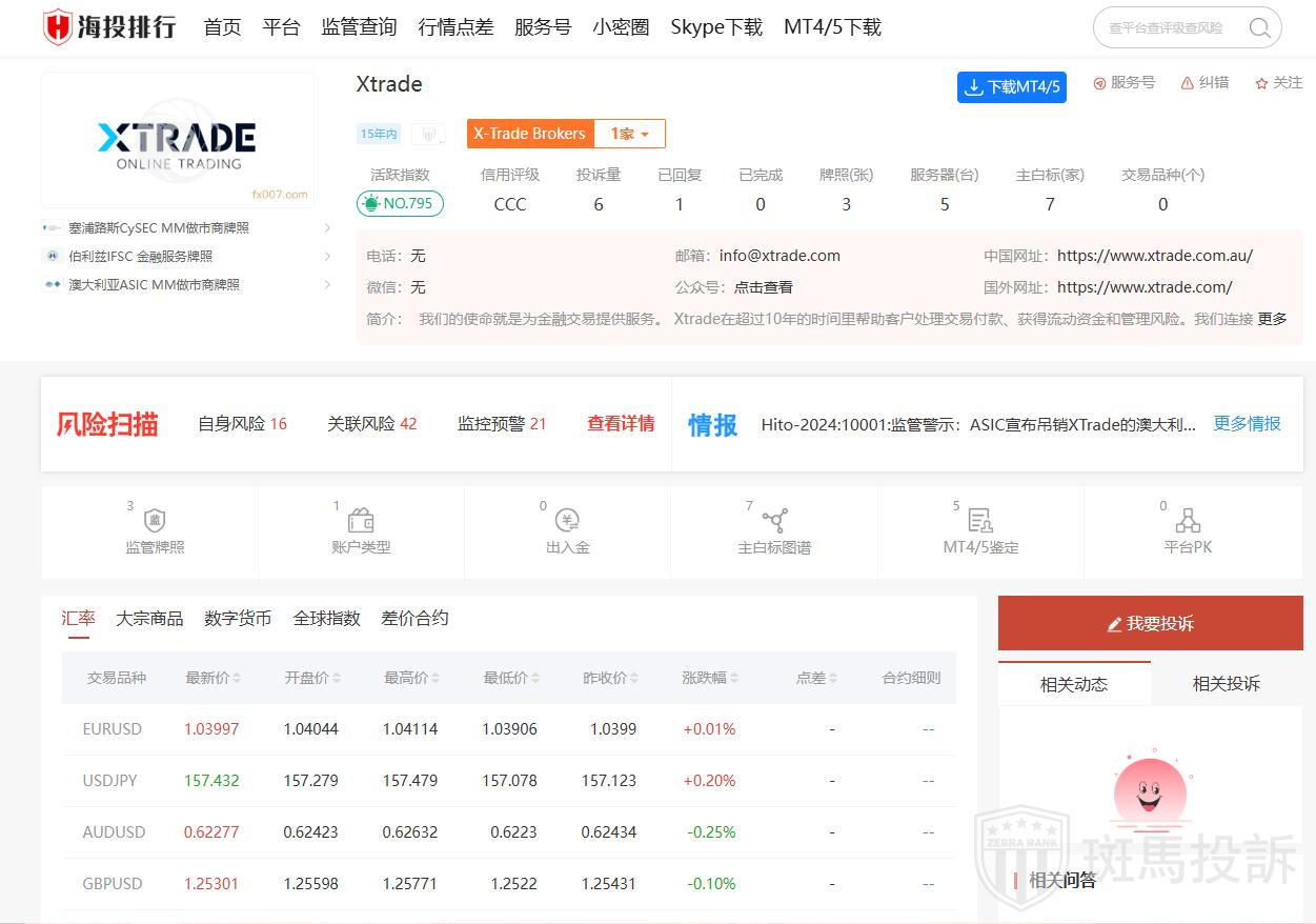 需要注意的是,Xtrade曾被香港证监会(SFC)列入警示名单,因为其在未经授权的情况下瞄向香港客户。其他的澳大利亚ASIC、塞浦路斯CySEC和伯利兹IFSC的监管也都被撤销,目前处在一个缺乏有效金融监管的环境内。投资者在选择Xtrade作为交易平台时,应充分了解相关风险,并采取适当的风险管理措施。