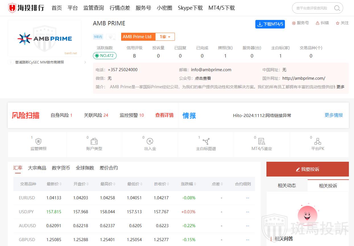 市场排名:在某些评估中,AMB PRIME在全球外汇平台中的排名并不靠前(例如,在海投排行中位列第472),这提示投资者应对其潜在风险保持警惕。