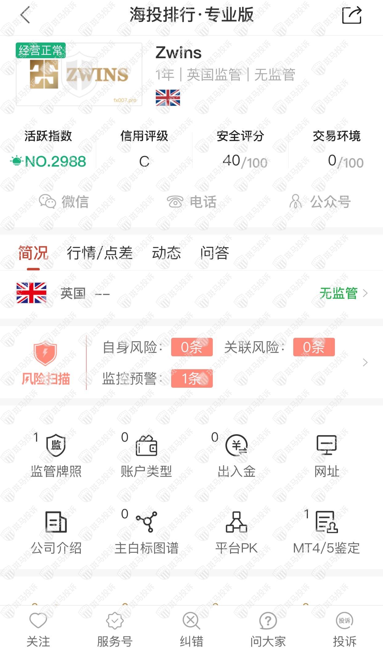 这家平台叫Zwins,成立于2021年,全球排名2988名,目前无监管,没有外汇牌照,不能做外汇保证金交易,风险扫描显示1条风险,投资者资金安全无保障。