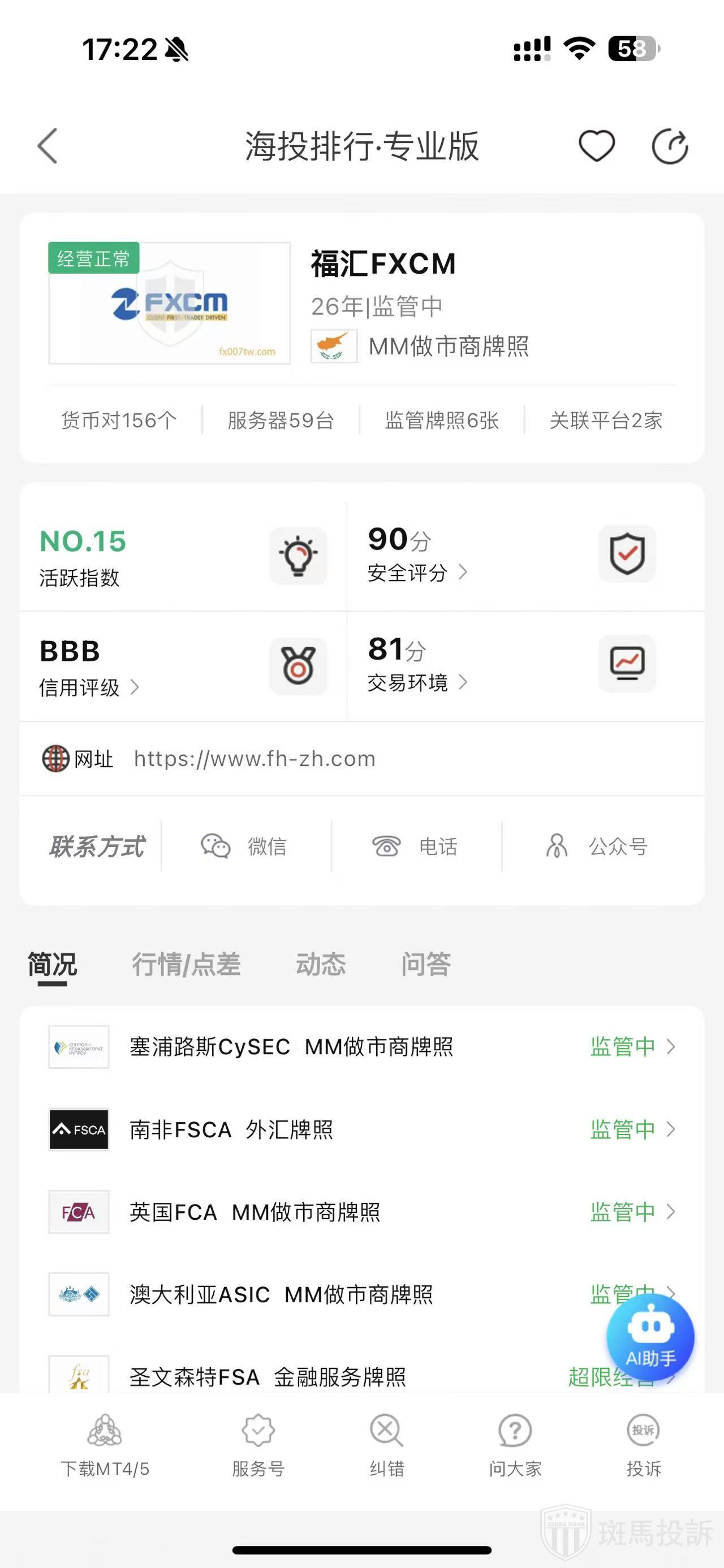 根据海投排行查询显示,这家平台叫福汇FXCM,成立于1999年,全球排名15名,安全评分90分,平台宣传称拥有6个国家的监管牌照,风险扫描预警有217条.