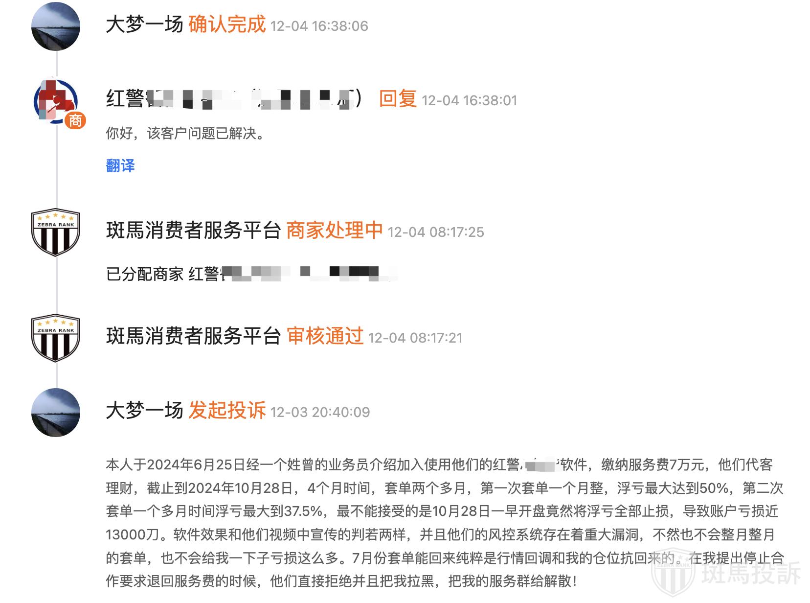 在人工智能迅猛发展的今天,智能交易软件成为了投资者们不可或缺的工具。然而,技术的复杂性和市场的不确定性也带来了一系列挑战。近期,斑马投诉网上的一则用户反馈引起了广泛关注,涉及到一款名为「红警」的交易软件。(经斑马投诉网授权转载https://www.bmts888.com/complaint/11498.html)