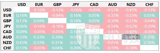 下表显示了澳元(AUD)对所列主要货币今日的变动百分比。[货币名称]对[货币名称]最强。
