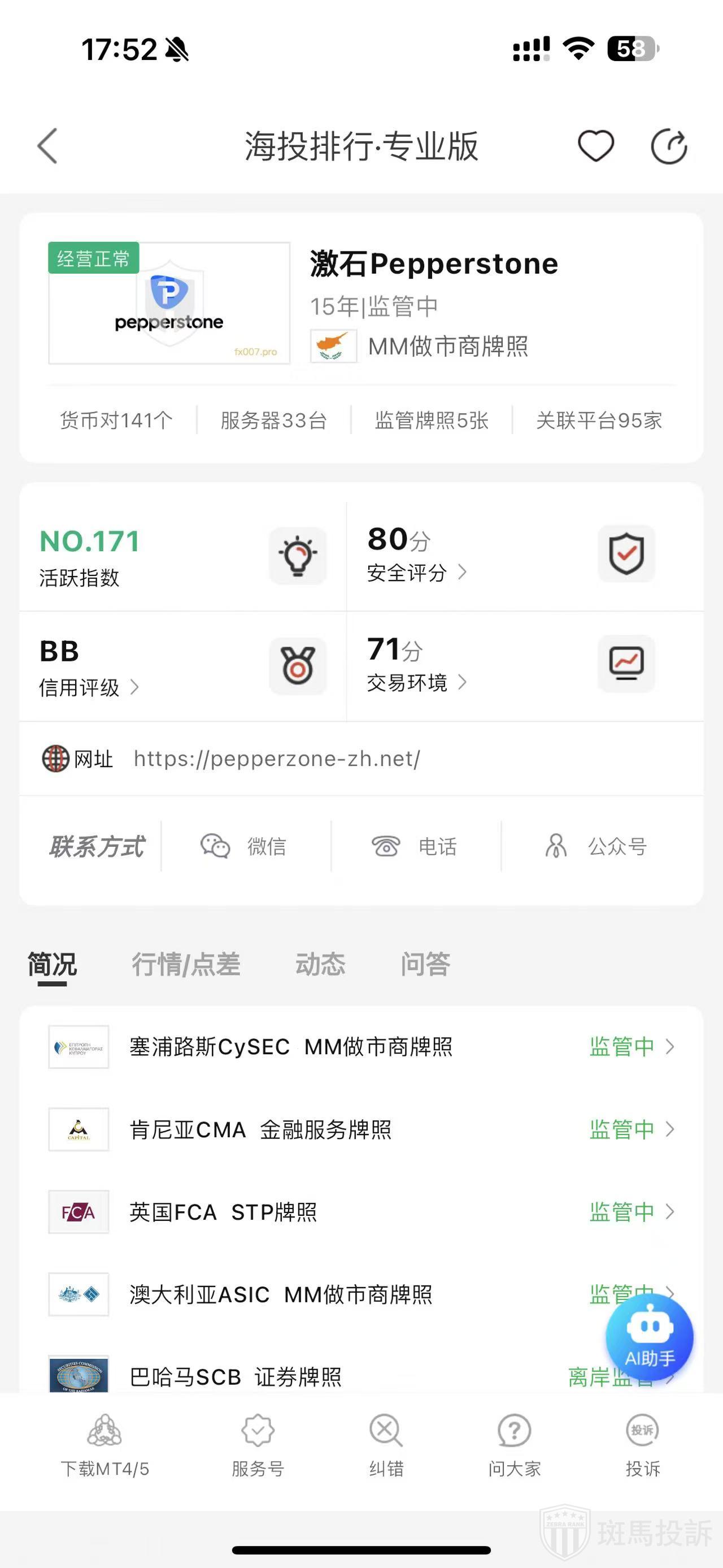 海投排行综合点评:激石Pepperstone目前官网属于正常运营中,投诉方面是因为合约报价错误或者入金延迟导致保障等交易环境问题,需要注意下。负面信息较少,各方评论总体还可以,交易品种多,就是投诉方面处理较慢。