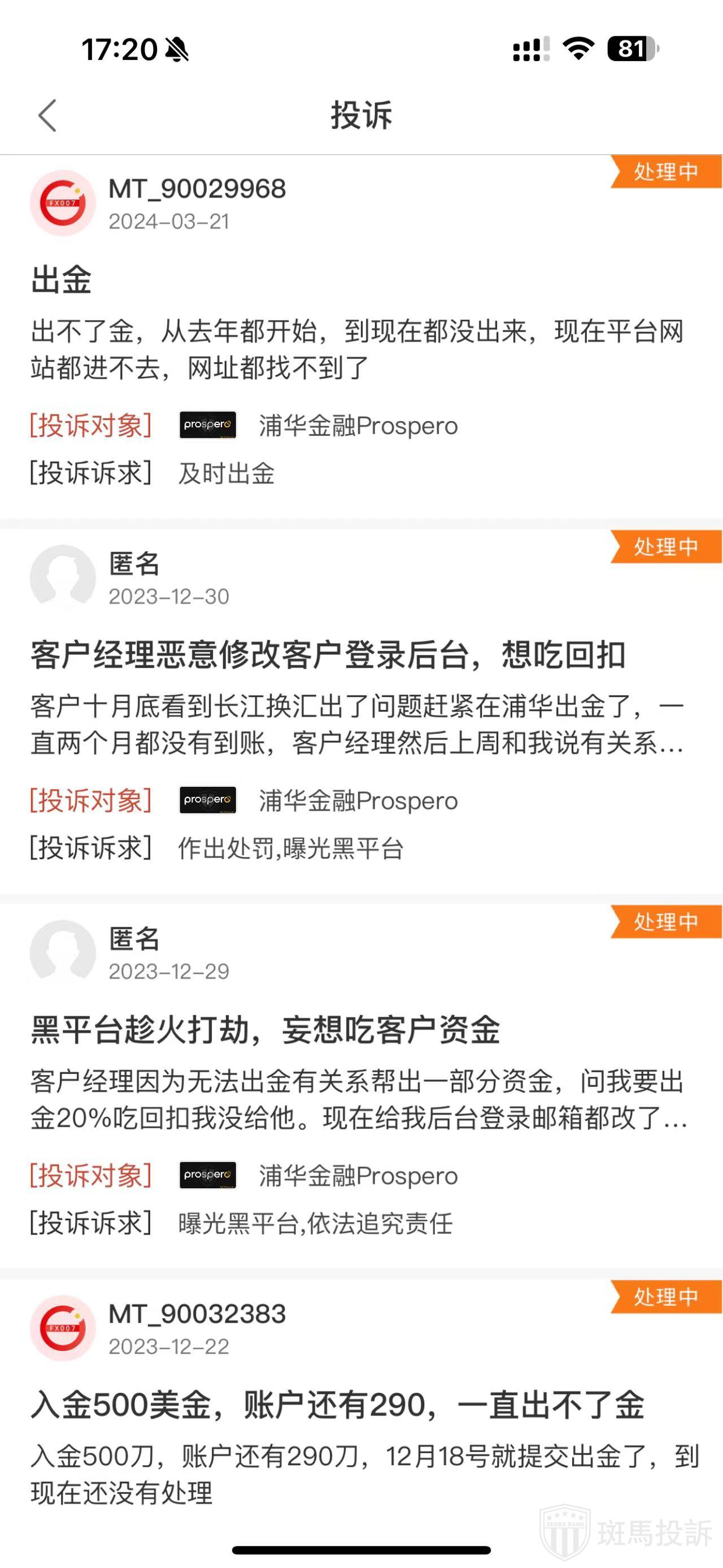 浦华金融平台现在在斑马投诉有23条投诉均未处理。