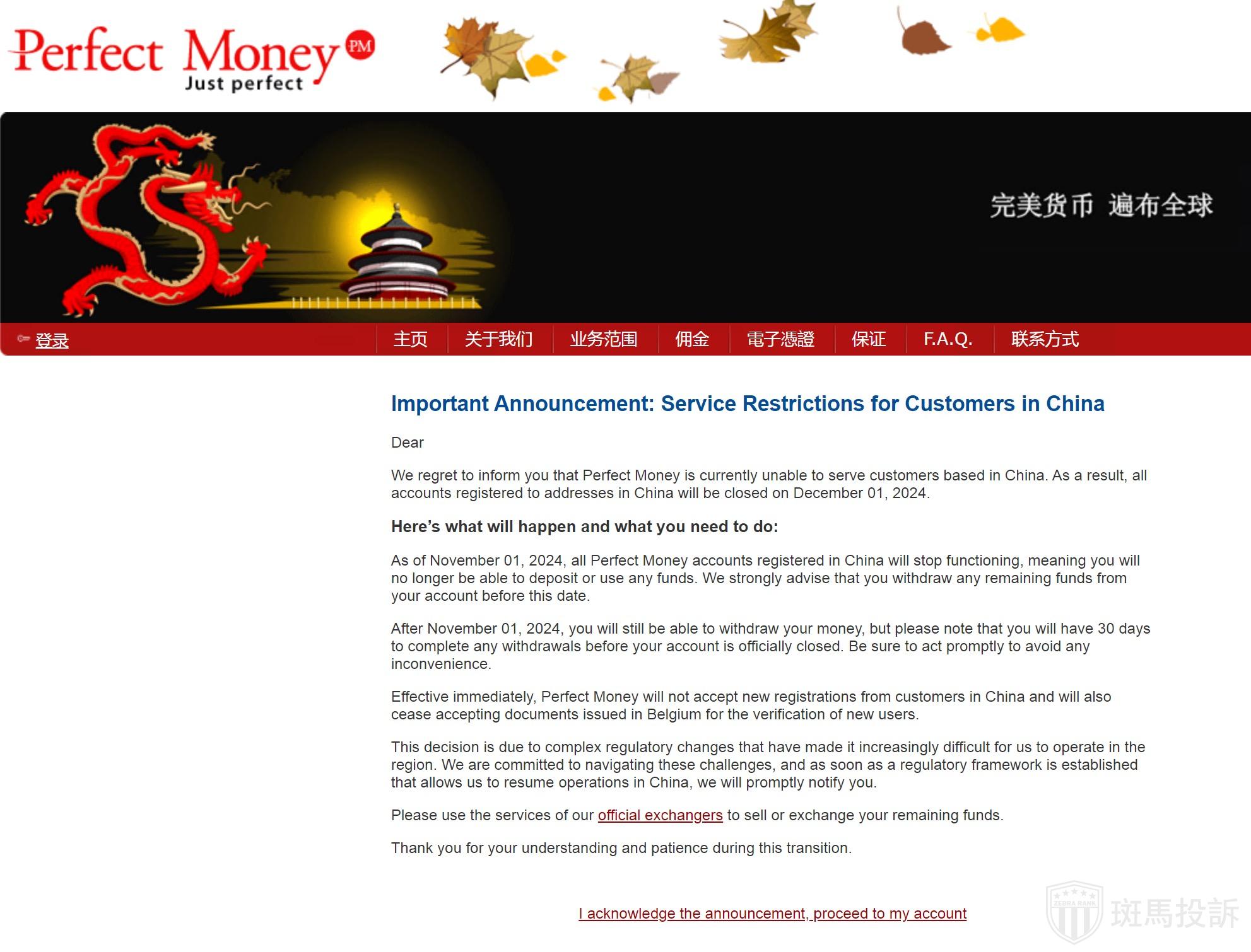 根据公开信息,Perfect Money在2024年11月1日发布公告称,由于复杂的监管变化,已暂停为中国用户提供服务。紧接着,在2024年11月19日,Perfect Money进一步宣布关闭所有缅甸用户的账户,并停止为缅甸提供任何服务。这一系列调整不仅影响了个人用户,也对依赖Perfect Money进行资金往来的交易平台造成了不小的冲击。