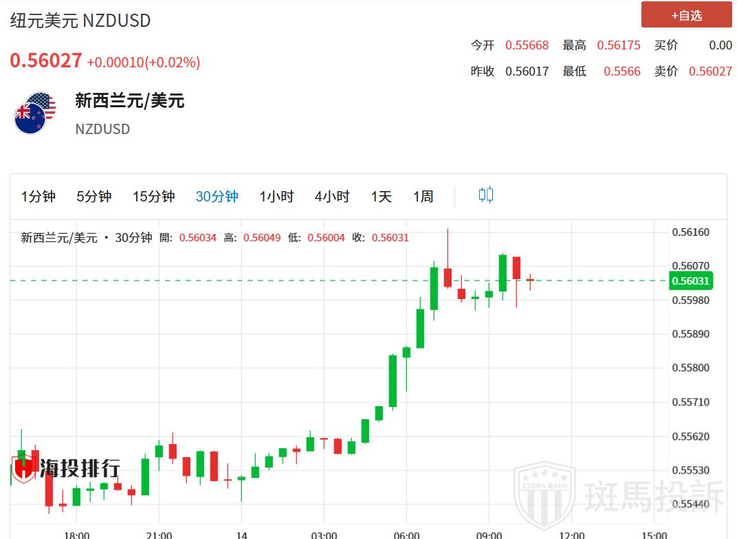 纽元/美元在周二亚洲时段上涨至接近0.5600,当日上涨0.60%。