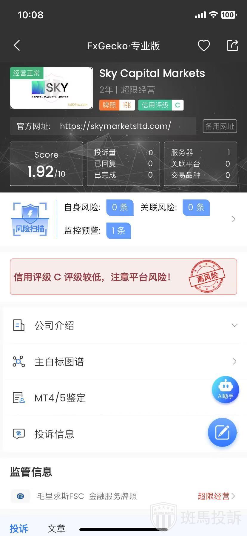 Sky Capital Markets,FxGecko评分1.92分,信用评级较低,建议投资者远离!