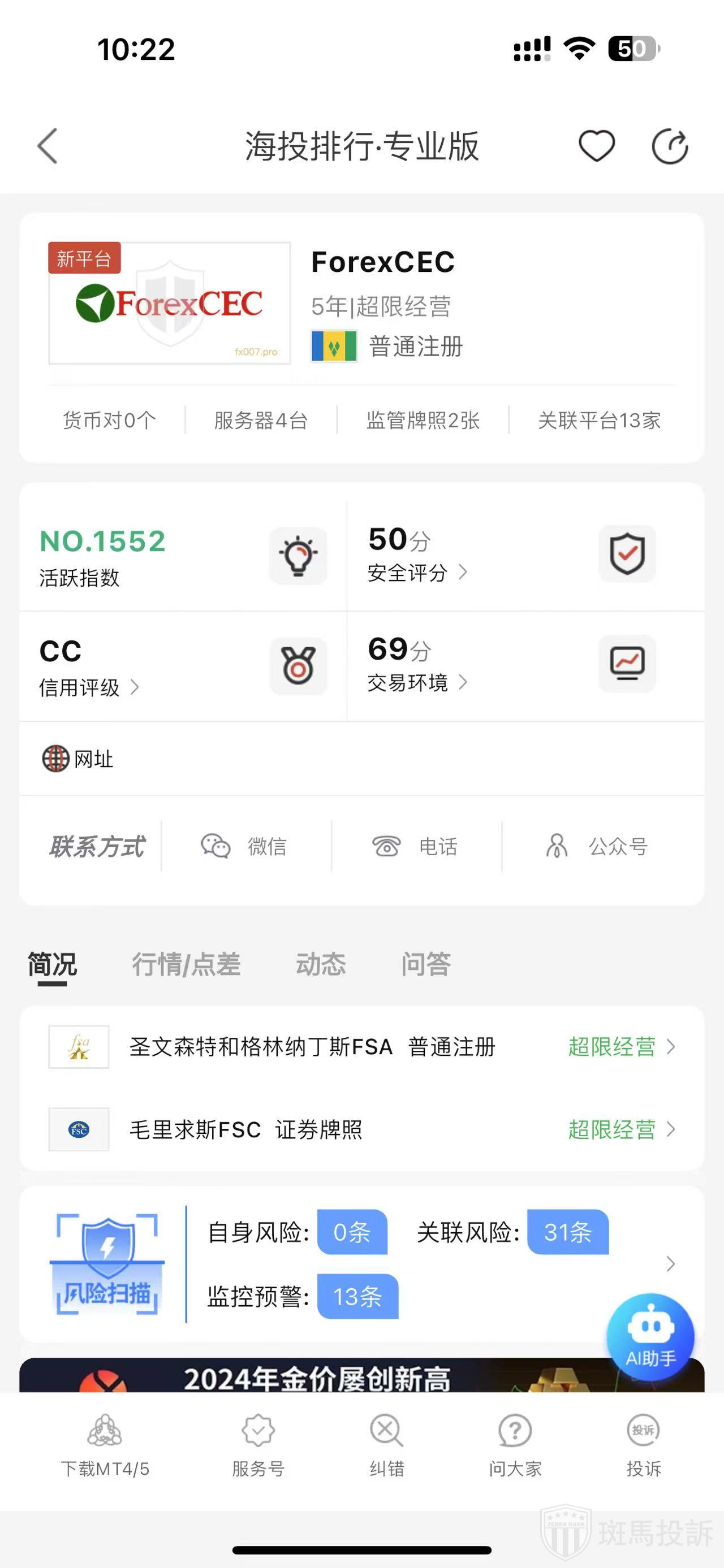 根据海投排行查询显示,这家平台叫ForexCEC,成立于2020年,全球排名1539名,安全评分50分,目前有圣文森特和格林纳丁斯FSA普通注册、毛里求斯FSC证券牌照2个监管牌照,风险扫描预警有42条.