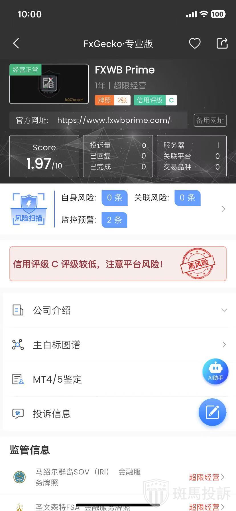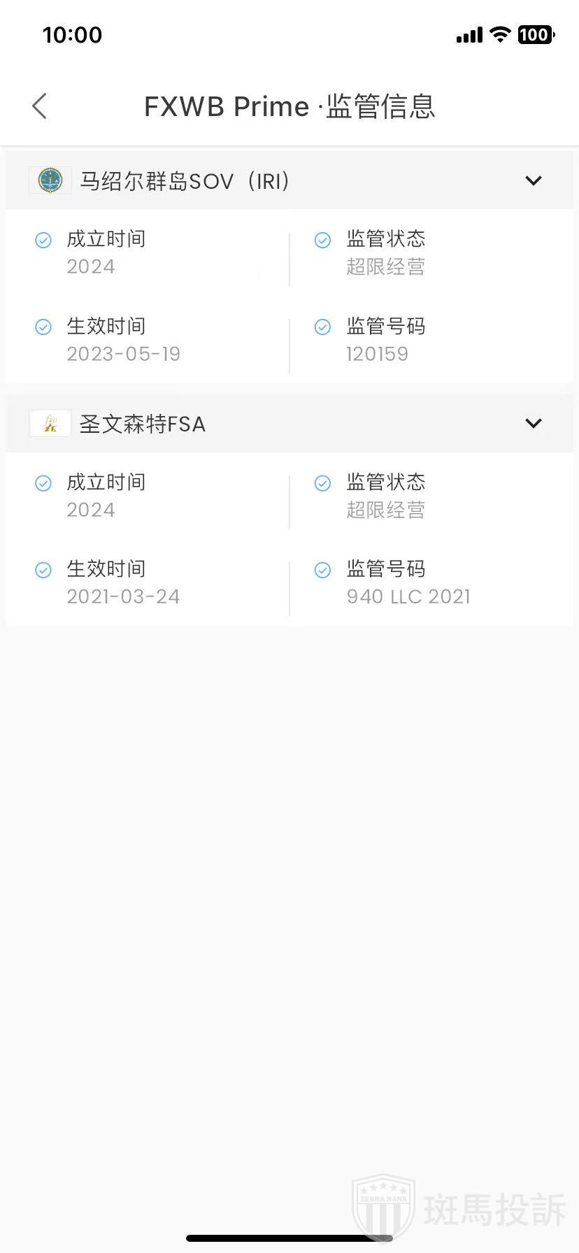 FXWB Prime ,在FxGecko显示1家监管信息。持有的马绍尔群岛SOV(IRI) 金融服务牌照、圣文森特FSA 金融服务牌照监管状态为超限经营。投资者资金安全无保障!