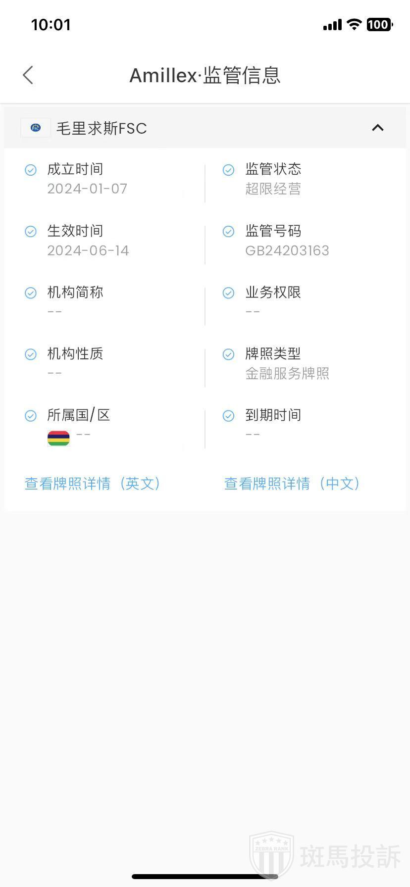 Amillex平台受毛里求斯FSC监管,取得金融服务牌照,监管证号GB24203163,属于超限经营范畴。
