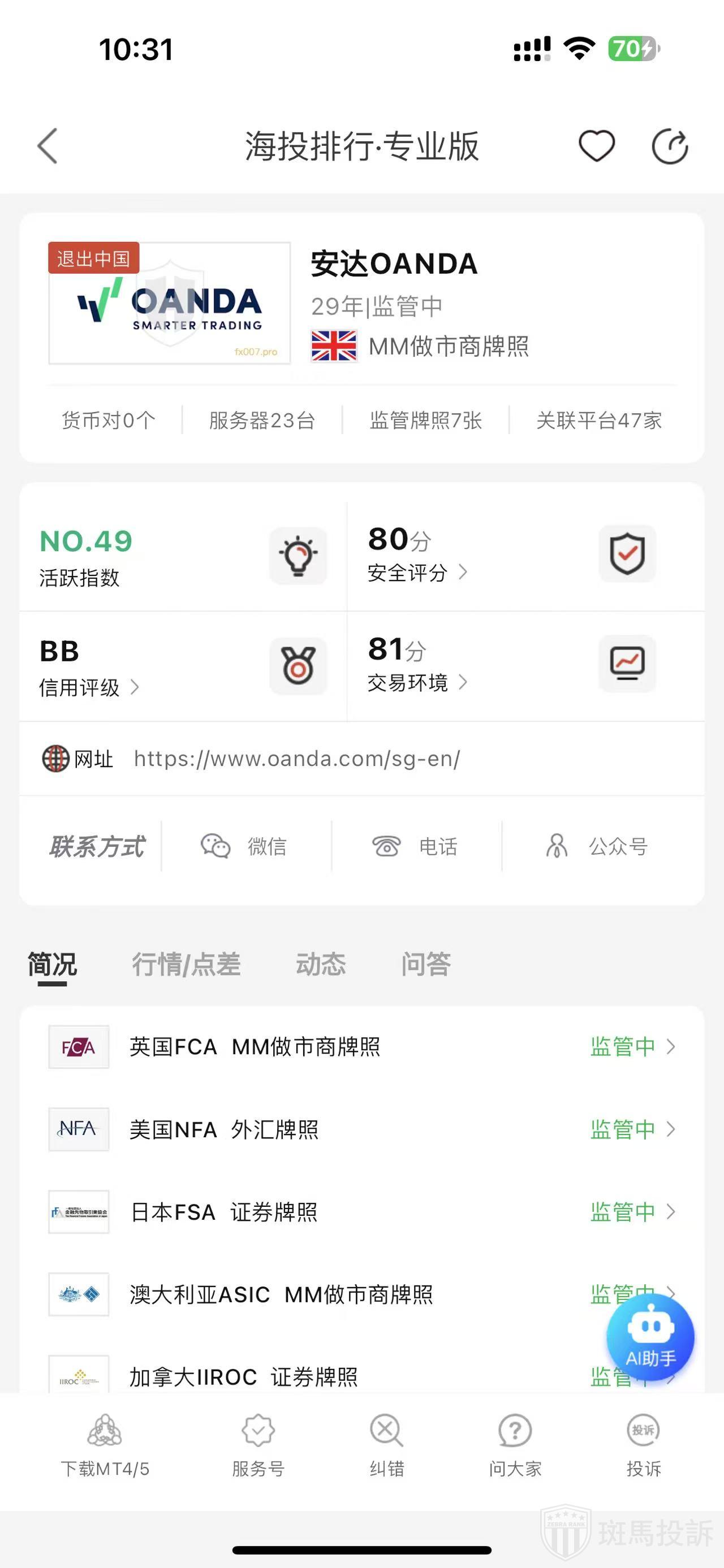 根据海投排行查询显示,这家平台叫安达OANDA,成立于1996年,全球排名49名,安全评分80分,目前宣传称拥有7个国家的监管外汇牌照,风险扫描946条.