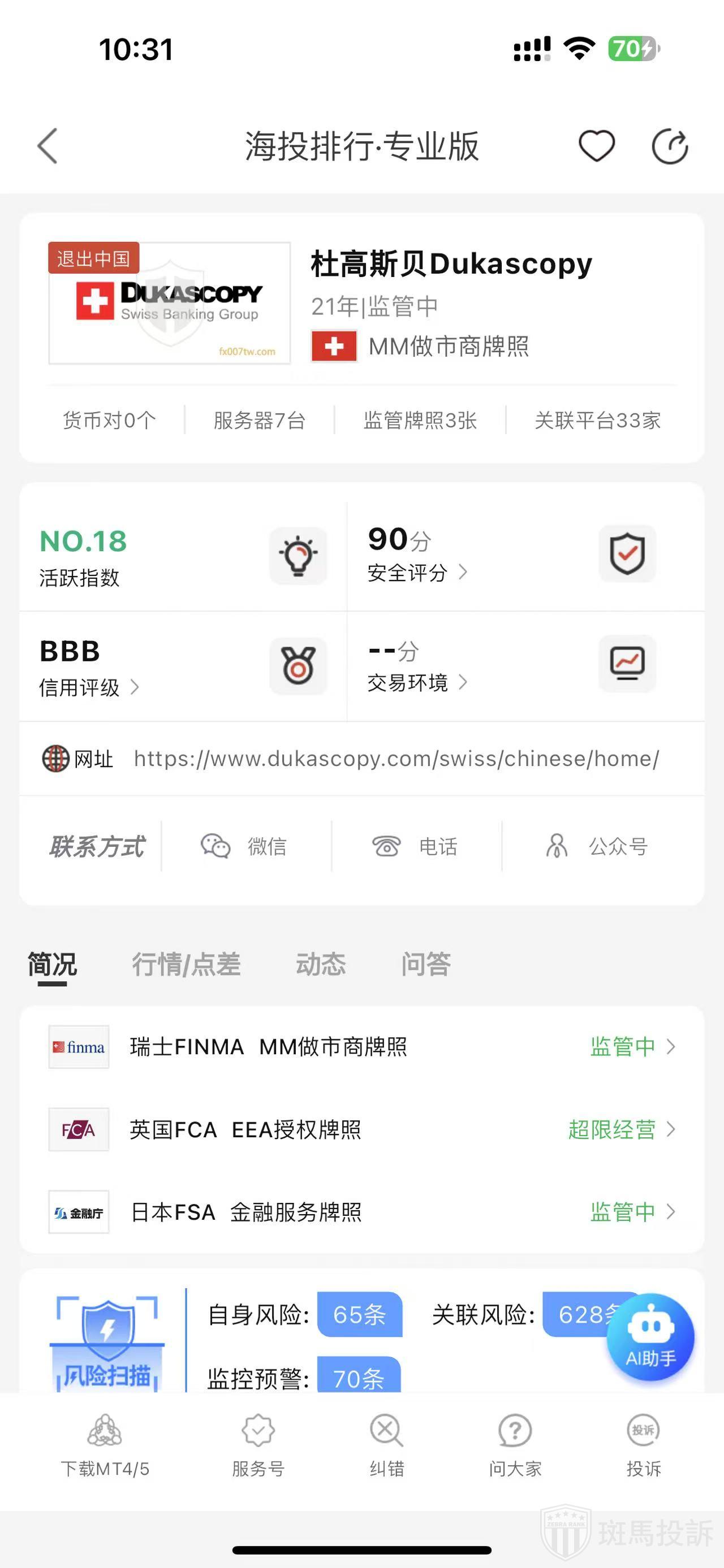 根据海投排行查询显示,这家平台叫杜高斯贝Dukascopy,成立于2004年,全球排名19名,安全评分90分,目前有2个国家的监管牌照,风险扫描751条.