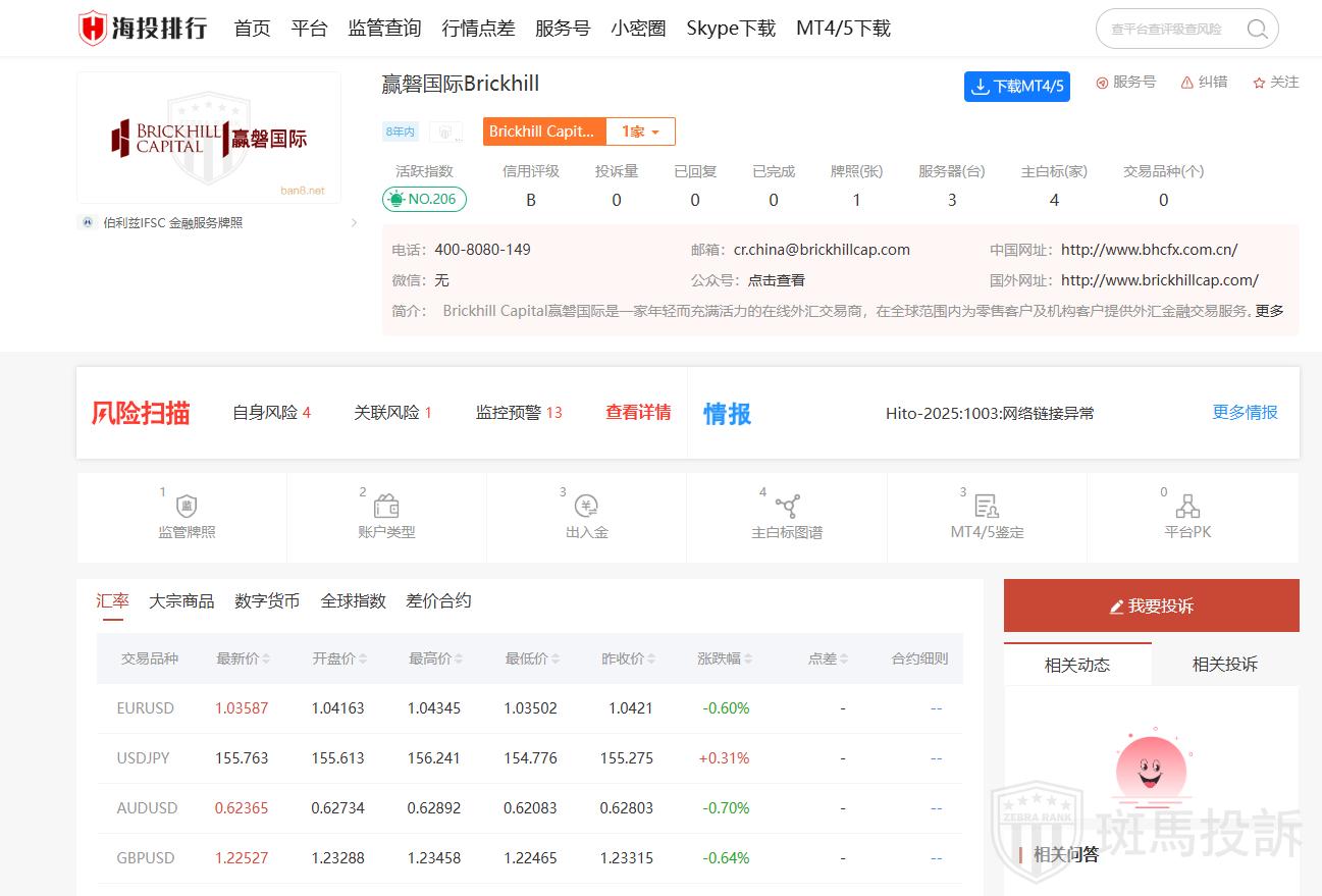赢磐国际(Brickhill Capital)是一家提供外汇交易服务的在线经纪商,其主要信息如下: