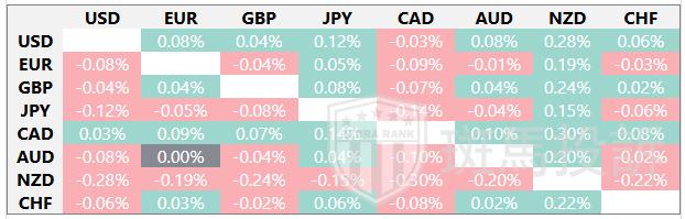 下表显示了澳元(AUD)对所列主要货币今日的变动百分比。澳元对加拿大元最弱。